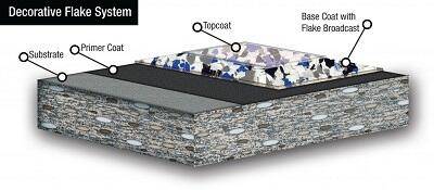 Having both epoxy and polyurethane applied to the floor gives your garage floor a complete, superior system that cannot be attained if just one of these components are used without the other. The epoxy component mechanically binds to the pores of the concrete. This acts to permanently bond the system to the concrete substrate. The epoxy alone is extremely durable, but when the polyurethane fortified topcoat is applied over it the end result is a floor system with superior durability, abrasion resistance (resistant to scratching) and stain resistance. Also, without a topcoat over the flakes, the edges of the flakes would collect dirt and grime. But by adding the topcoat it seals the flakes in so that they are permanently protected. This allows the floor to be easily cleaned and the flakes will not dull or become permanently soiled. The polyurethane ensures that your floor will maintain its showroom quality, high gloss finish for years to come.